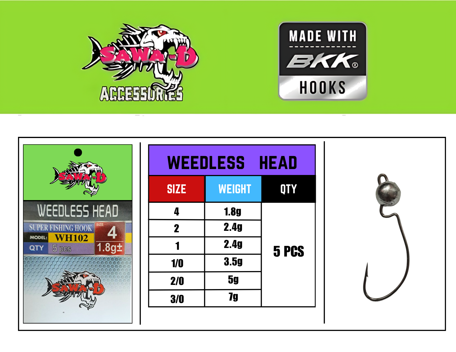 1 – 2.4g, 1/0 – 3.5g, 2 – 2.4g, 2/0 – 5g, 3/0 – 7g